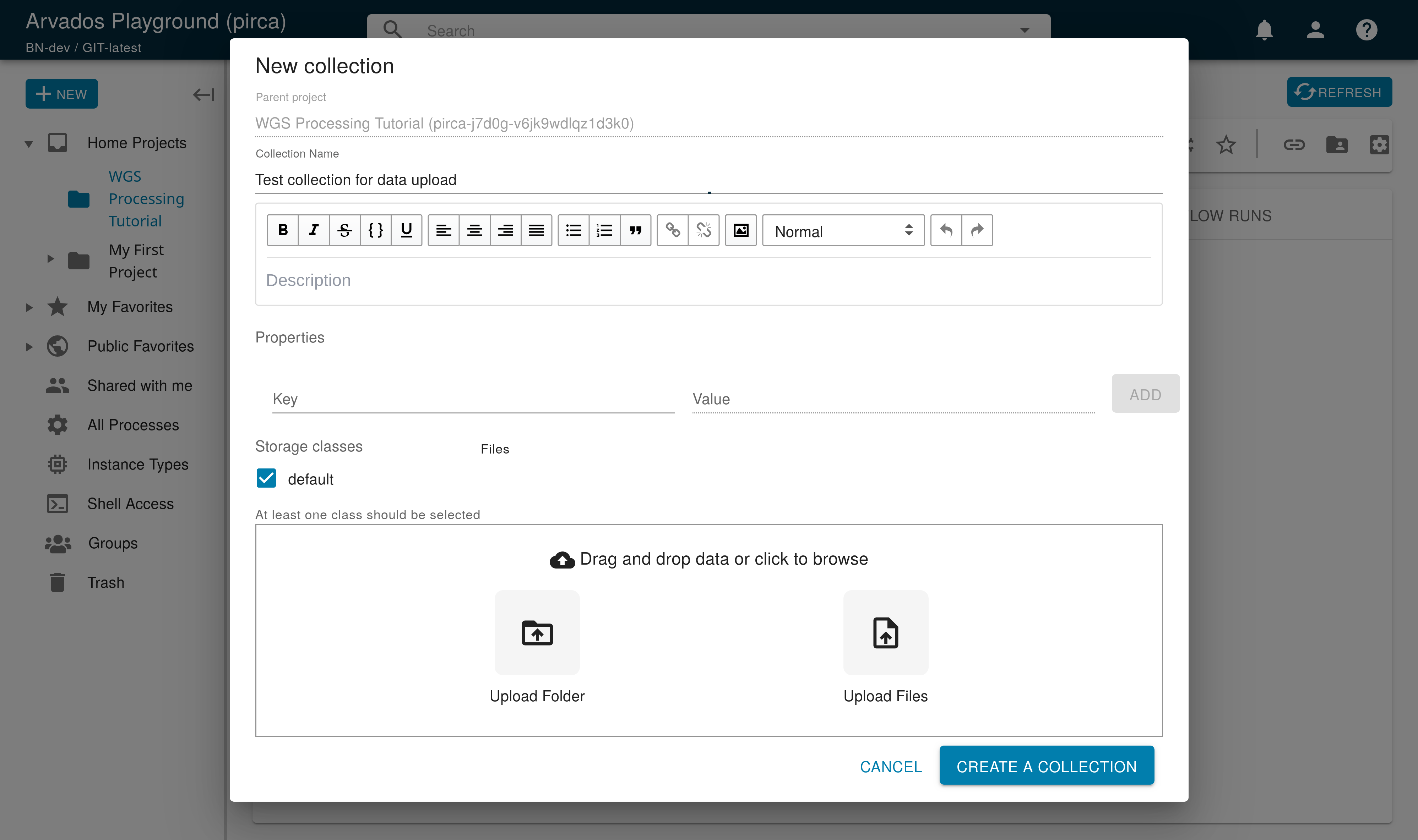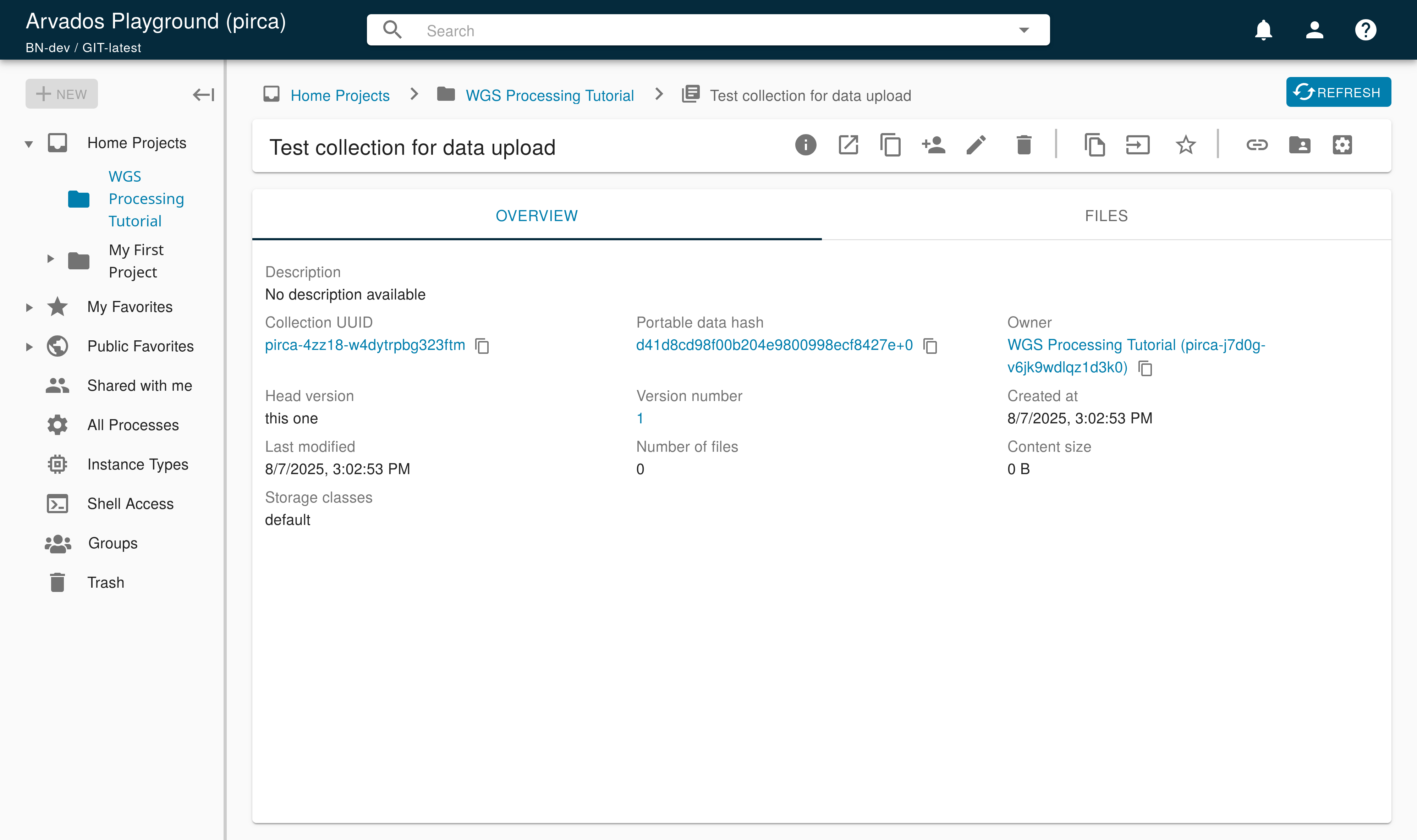 Visit the Workbench and go to your  Home Projects.  Your newly uploaded collection should appear in the “Data” tab.  The collection name printed by arv-put will appear under the Name column, and its Type will be “Data collection”.