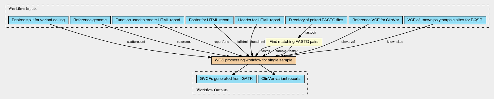 Below are diagrams of the main workflow which runs the processing across multiple sets of fastq and the main subworkflow (run multiple times in parallel by the main workflow) which processes a single set of FASTQs. This main subworkflow also calls other additional subworkflows including subworkflows that perform variant calling using GATK in parallel by regions and generate the ClinVar HTML variant report. These CWL diagrams (generated using CWL viewer) will give you a basic idea of the flow, input/outputs and workflow steps involved in the tutorial example. However, if you aren’t used to looking at CWL workflow diagrams and/or aren’t particularly interested in this level of detail, do not worry. You will not need to know these particulars to run the workflow.
