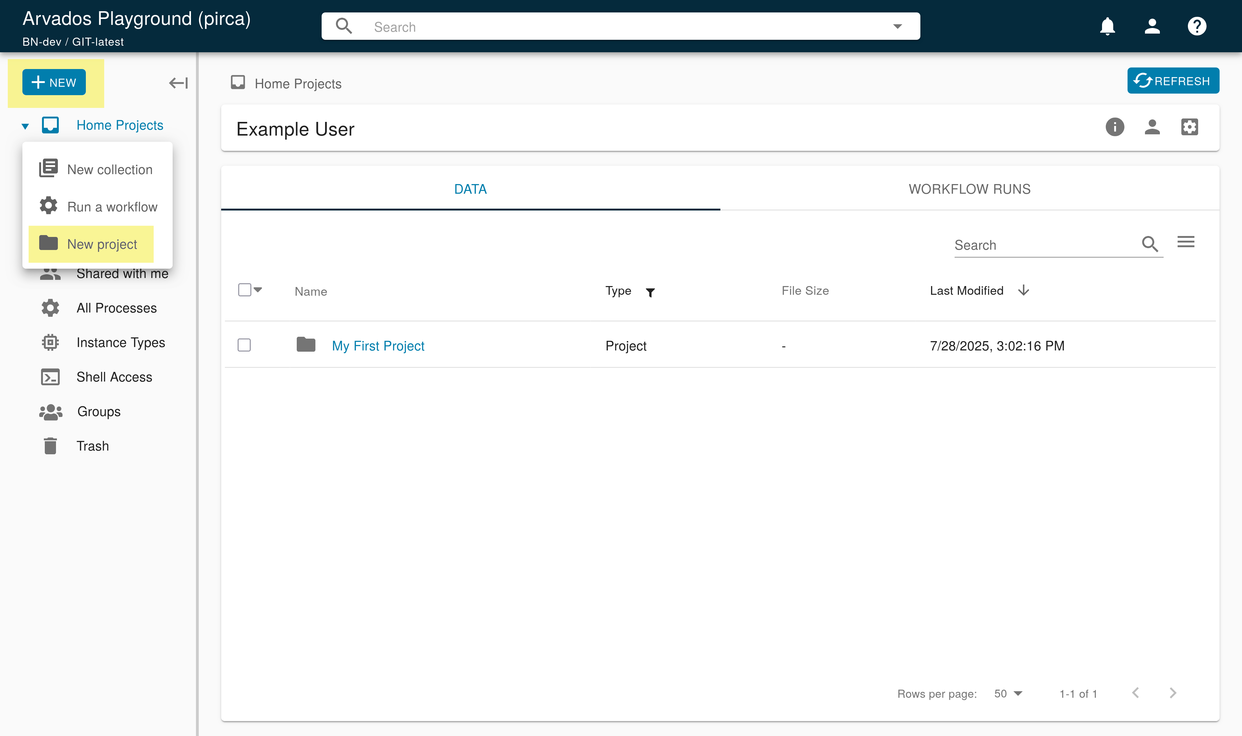 Projects in Arvados help you organize and track your work – and can contain data, workflow code, details about workflow runs, and results. Let’s begin by setting up a new project for the work you will be doing in this walkthrough.