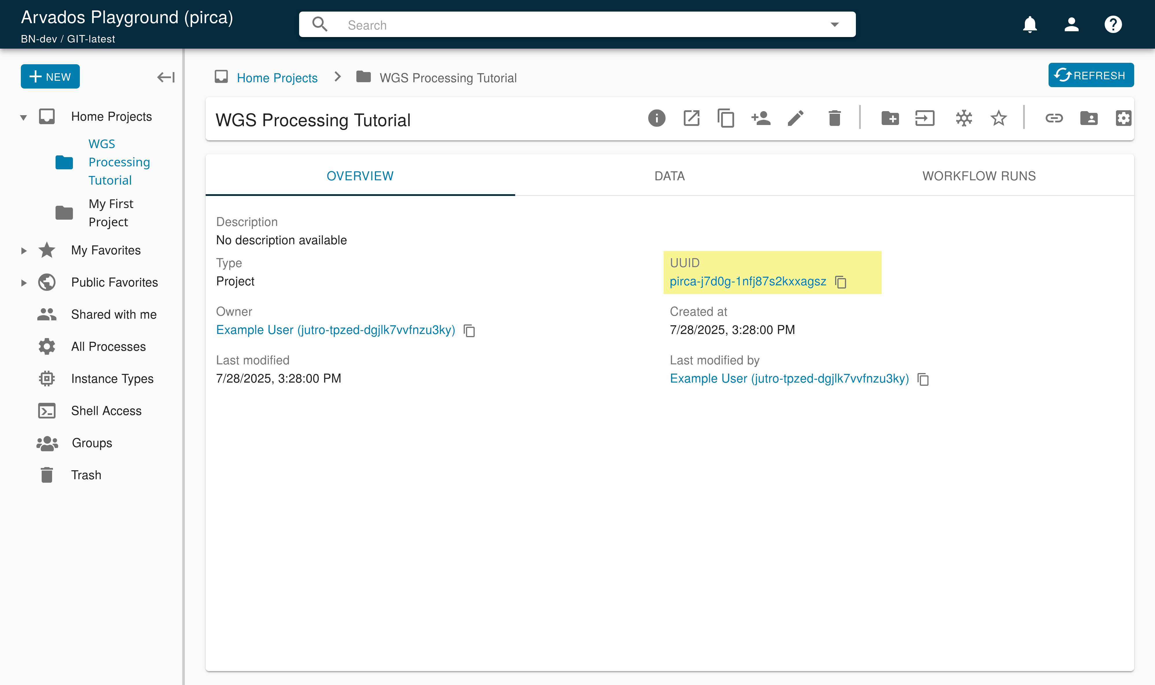 Let’s name your project “WGS Processing Tutorial”. You can also add a description of your project by typing in the Description – optional field. The universally unique identifier (UUID) of the project can be found in the URL, or by clicking the info button on the upper right-hand corner.
