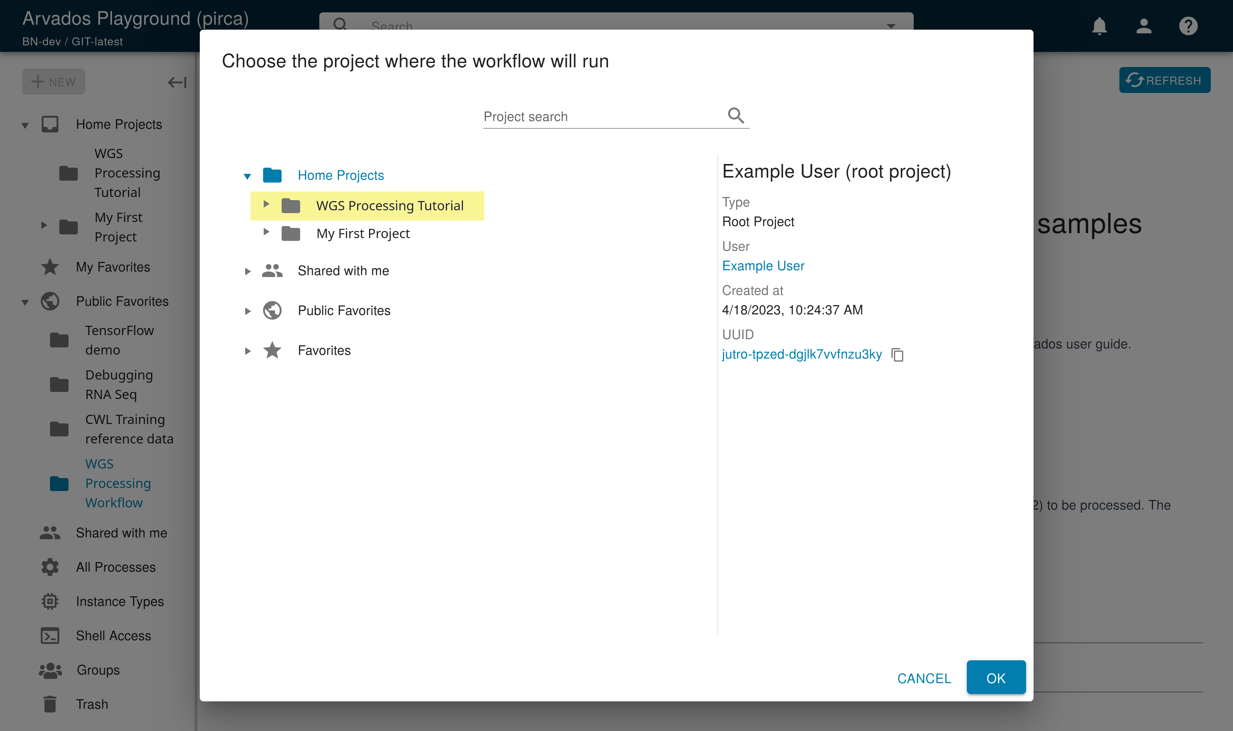Let’s find the registered WGS Processing Workflow and run it interactively in our newly created project.